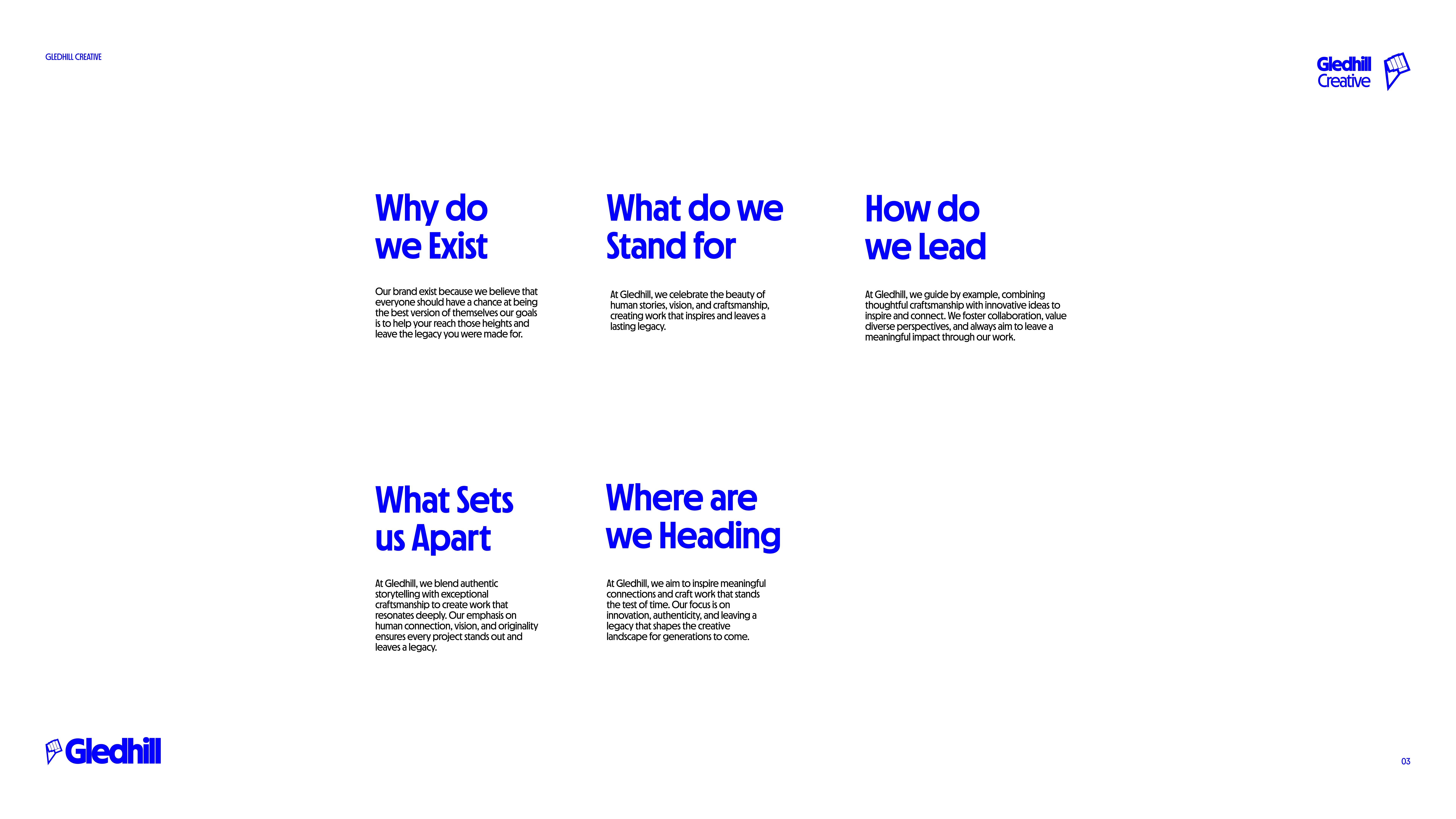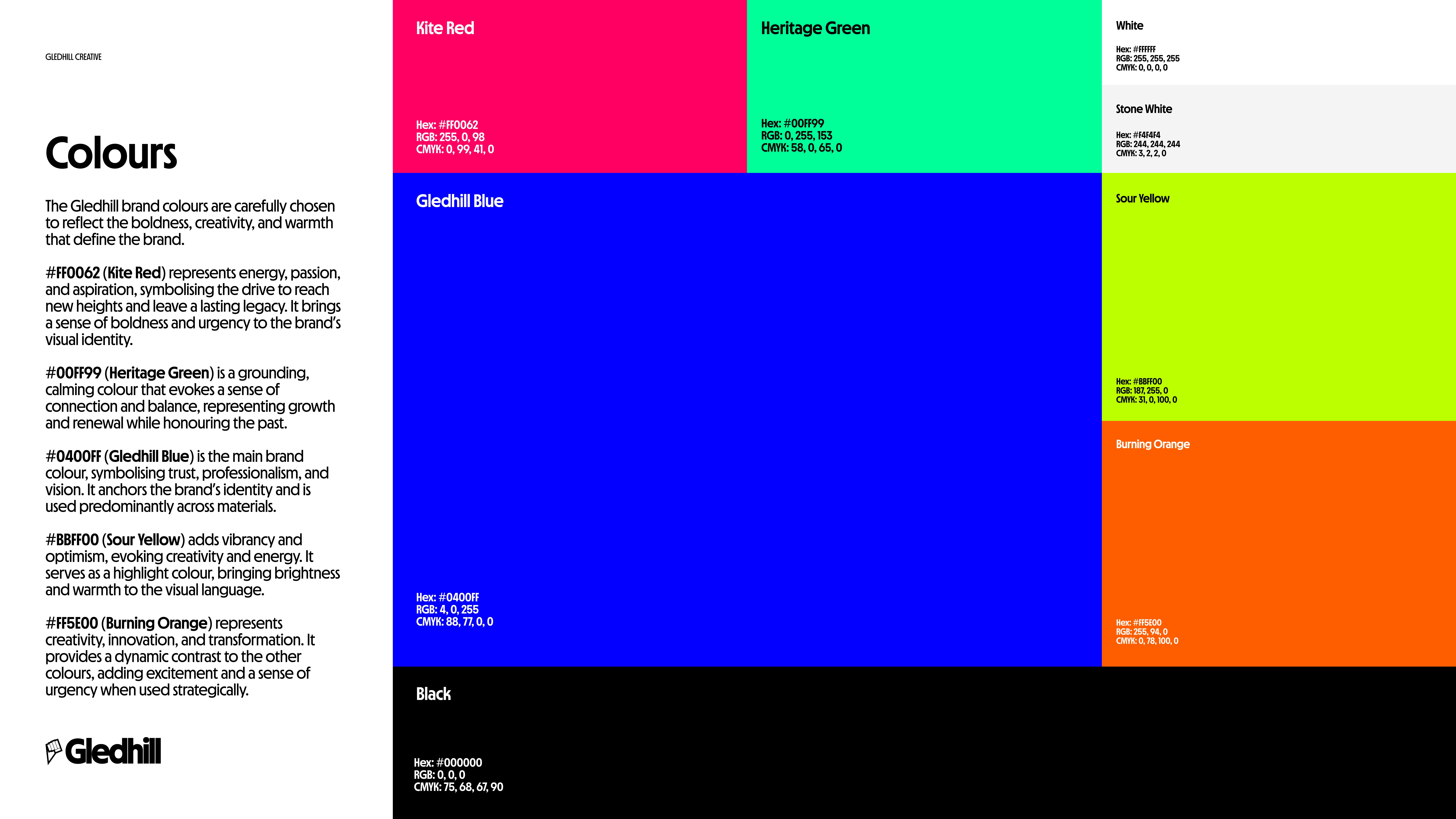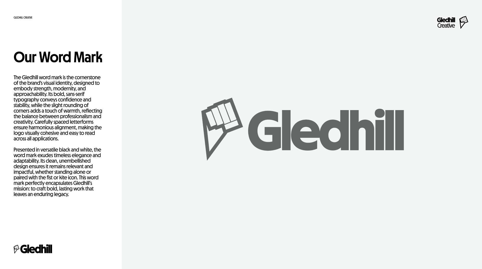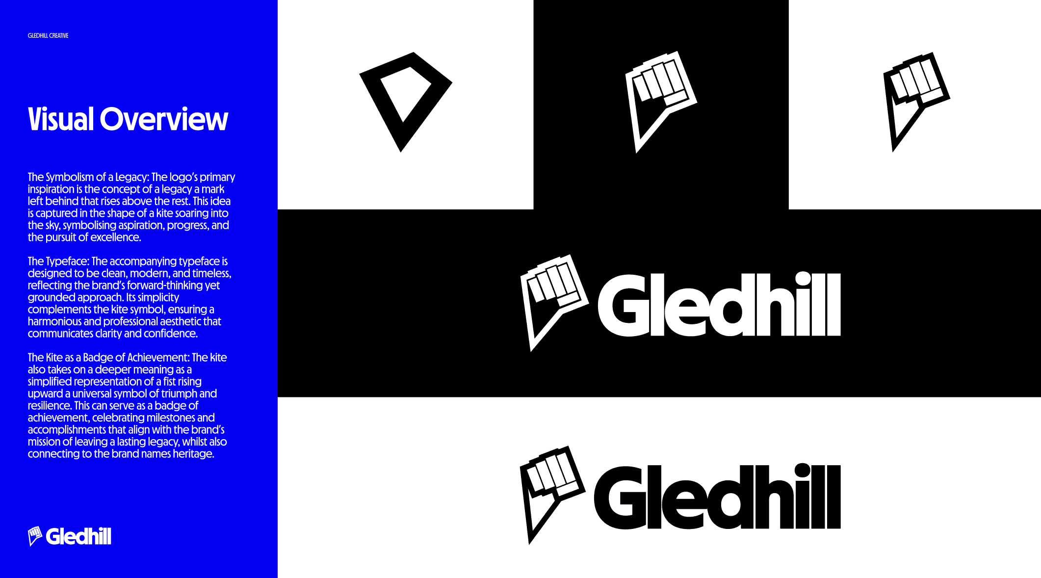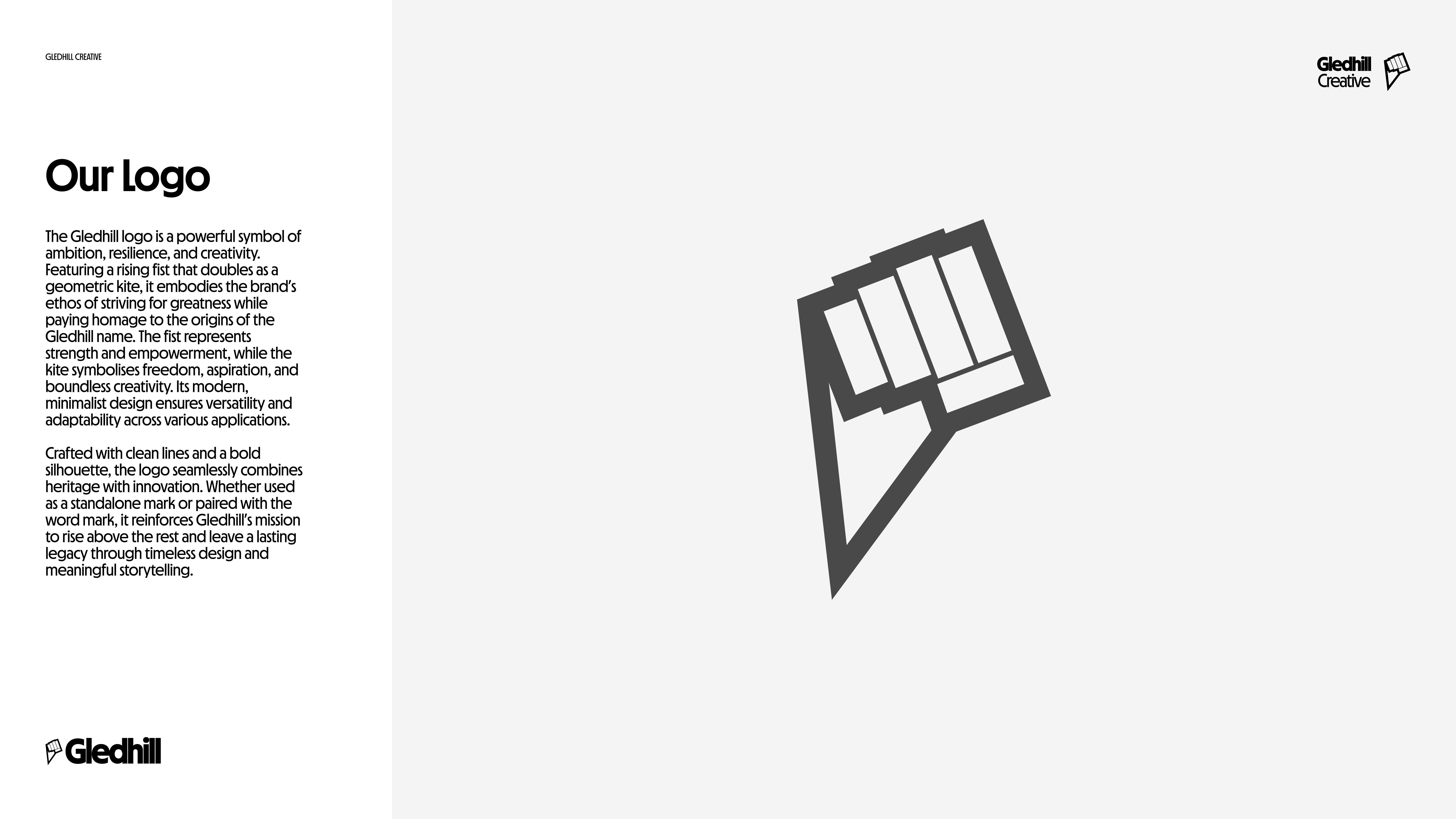 The Gledhill brand is centered around three key elements: The Rising Fist: A symbol of ambition, resilience, and rising above the rest. This bold icon reflects our commitment to striving for excellence while tying into the geometric shape of a kite—a nod to the origins of the Gledhill name and a metaphor for boundless creativity. The Wordmark: Clean, modern typography that balances strength and approachability, representing the studio’s professionalism and creative spirit. The Kite Icon: A sleek, geometric design that pays homage to heritage while embodying freedom, aspiration, and human expression. With a minimalist yet impactful design language, Gledhill captures the essence of leaving a legacy—one rooted in craftsmanship, vision, and the beauty of human creativity. Explore how Gledhill can bring your ideas to life and create work that truly stands the test of time. Together, we’ll leave a lasting legacy.